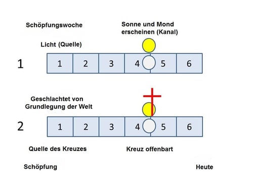 So sehen wir die Offenbarung des Kreuzes von Christus so, als wäre es das Kreuz des Vaters. Der Vater gab den auf, der ihm am kostbarsten war. Der Vater ertrug den Schrecken einer großen Finsternis um ein Lamm bereitzustellen. Der Same von Isaak wurde nicht offenbart bevor ein Schrecken der Finsternis von Abraham erfahren wurde. Wir können das weiterführen bis zur Geschichte von Adam und Eva. Eva konnte nicht offenbart werden, bevor Adam nicht in Schlaf versetzt wurde. Wir wissen, dass Adam und Eva erst erschaffen wurden nach der Rebellion im Himmel, deshalb existierte das Kreuz bereits und die Geschichte des Kreuzes ist offenbart in der Schöpfung von Adam und Eva.